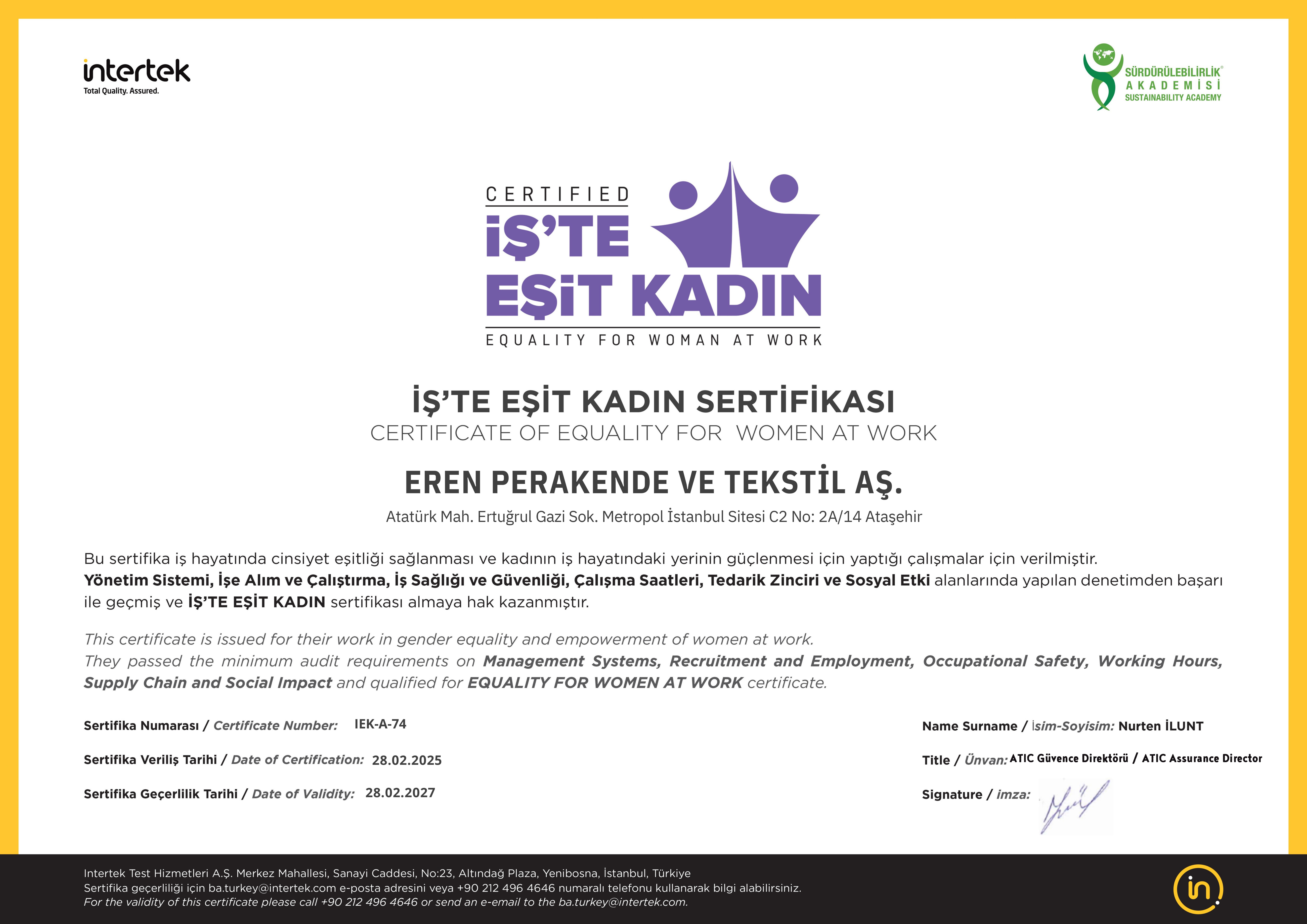Eren Perakende, Sürdürülebilirlik Akademisi ve Intertek iş birliğiyle gerçekleştirilen bağımsız denetimi başarıyla tamamlayarak, perakende sektöründe “İş’te Eşit Kadın Sertifikası”nı kazanan ilk şirket oldu.